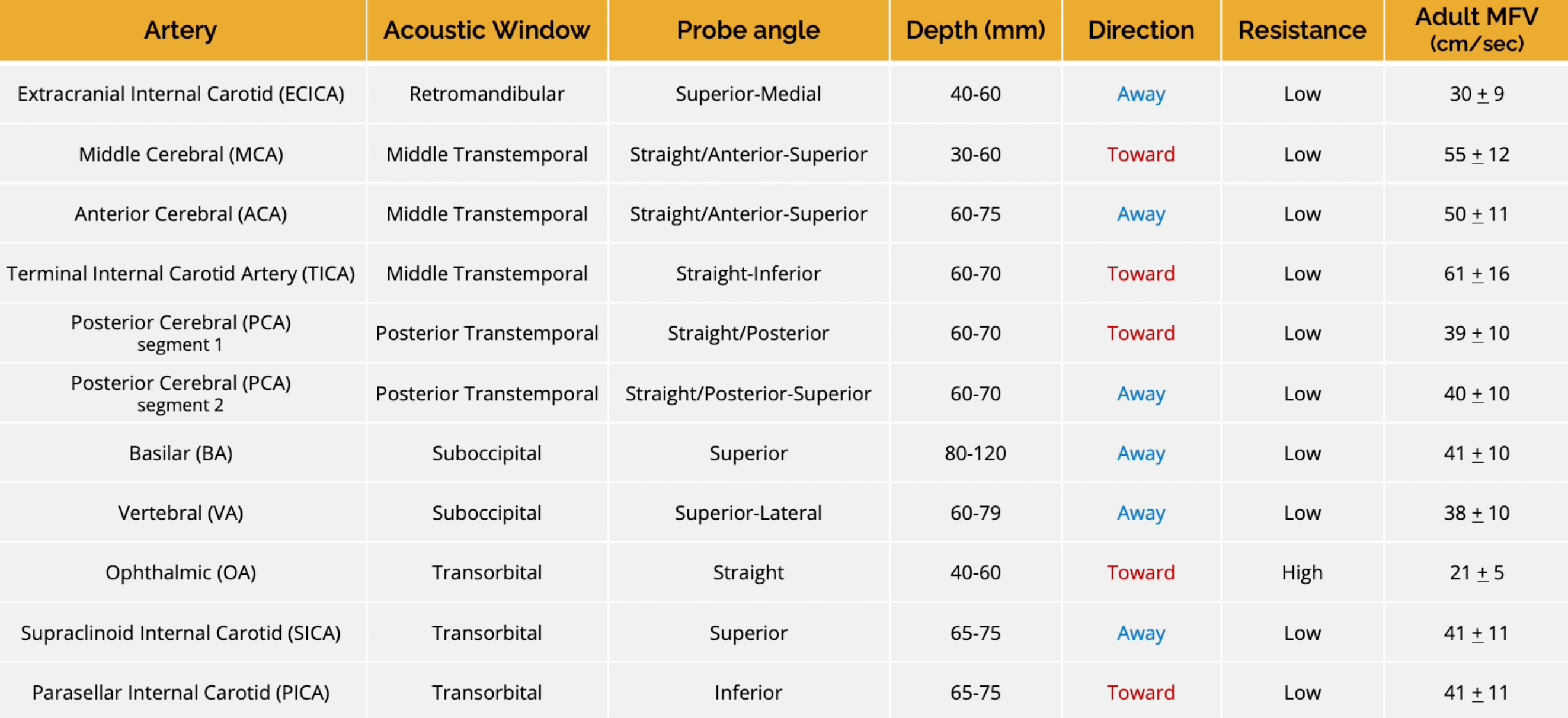 Flow resistance is usually assessed by PI, calculated by subtracting EDV from PSV and dividing the value by MFV. This is the most frequently used TCD parameter to determine the flow resistance. PI is independent of the angle of insonation, has no unit. High resistance blood flow ≥ 1.2